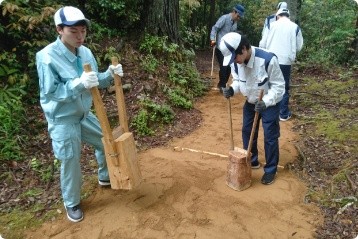 The Sacred Sites and Pilgrimage Routes in the Kii Mountain Range is a UNESCO World Heritage Site comprising three sacred sites and pilgrimage routes in Wakayama, Nara, and Mie prefectures. To protect and utilize these areas, mainly new employees help with road repairs along the Kumano Kodo. These regular repairs, which involve fixing roads and building structures, are essential for the prevention of landslides along natural trails in the mountains. Through these activities, new employees are learning the importance of cultural and environmental protection.